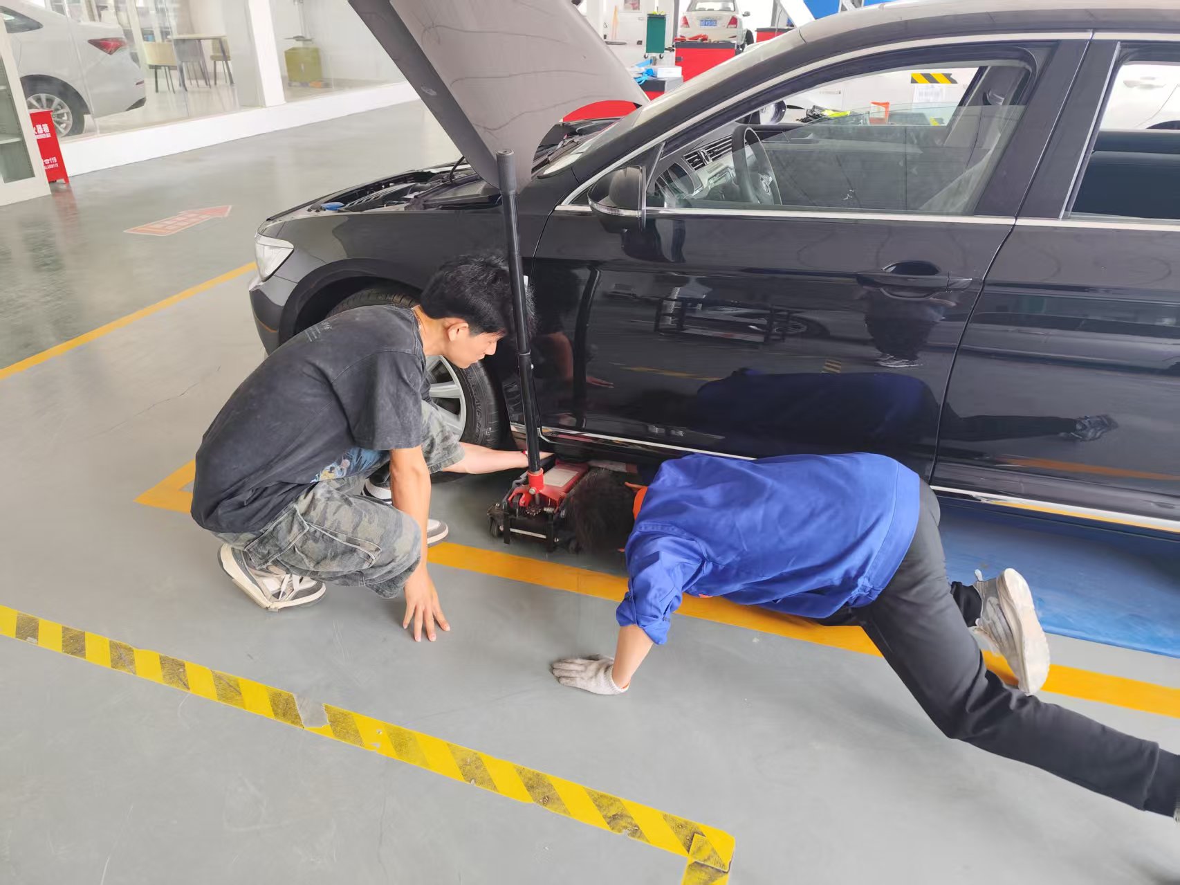 比赛现场气氛热烈,来自不同班级的参赛选手们精神抖擞、斗志昂扬。随着裁判一声令下,选手们迅速投入到紧张的比赛中。他们熟练地操作着千斤顶,精准地将车辆顶起,然后有条不紊地拆卸轮胎螺丝、取下旧轮胎、安装新轮胎并紧固螺丝。每一个动作都展现出扎实的专业功底和娴熟的操作技能。